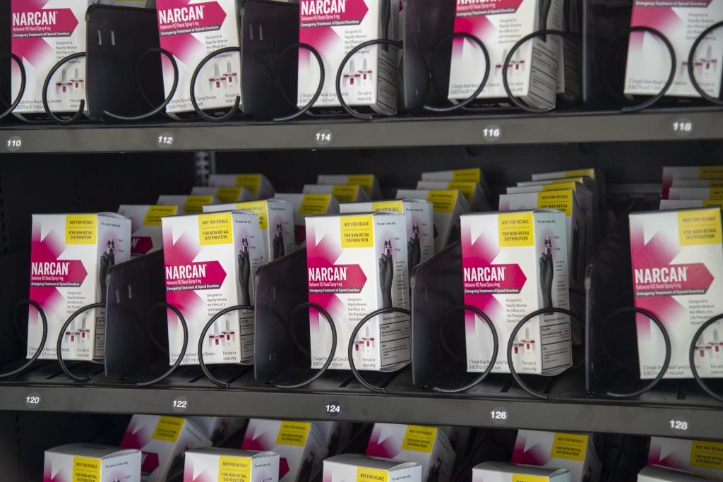 Naloxone is a nasal spray approved by the Food and Drug Administration that can rapidly reverse the effects of an opioid overdose. The spray can quickly restore normal breathing to a person if their breathing has slowed or stopped. Each box of naloxone available in the machines contains two doses.