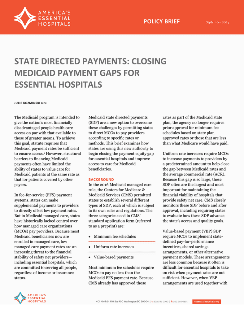 - Medicaid State Directed Payments: Closing the Payment Gap for Essential Hospitals Policy Brief