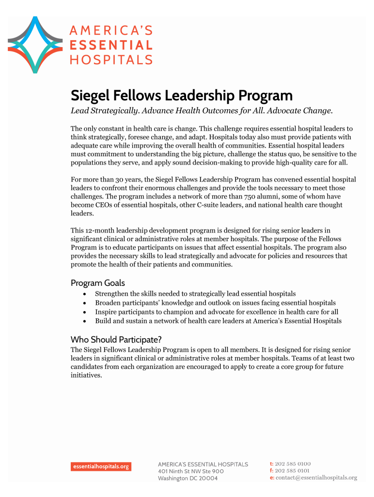 This 12-month program is designed for rising senior leaders in significant clinical or administrative roles at member hospitals. The purpose of the Siegel Fellows program is to educate participants on issues that impact essential hospitals and provide the necessary skills to lead strategically and advocate for policies and resources that promote high quality health care for all.