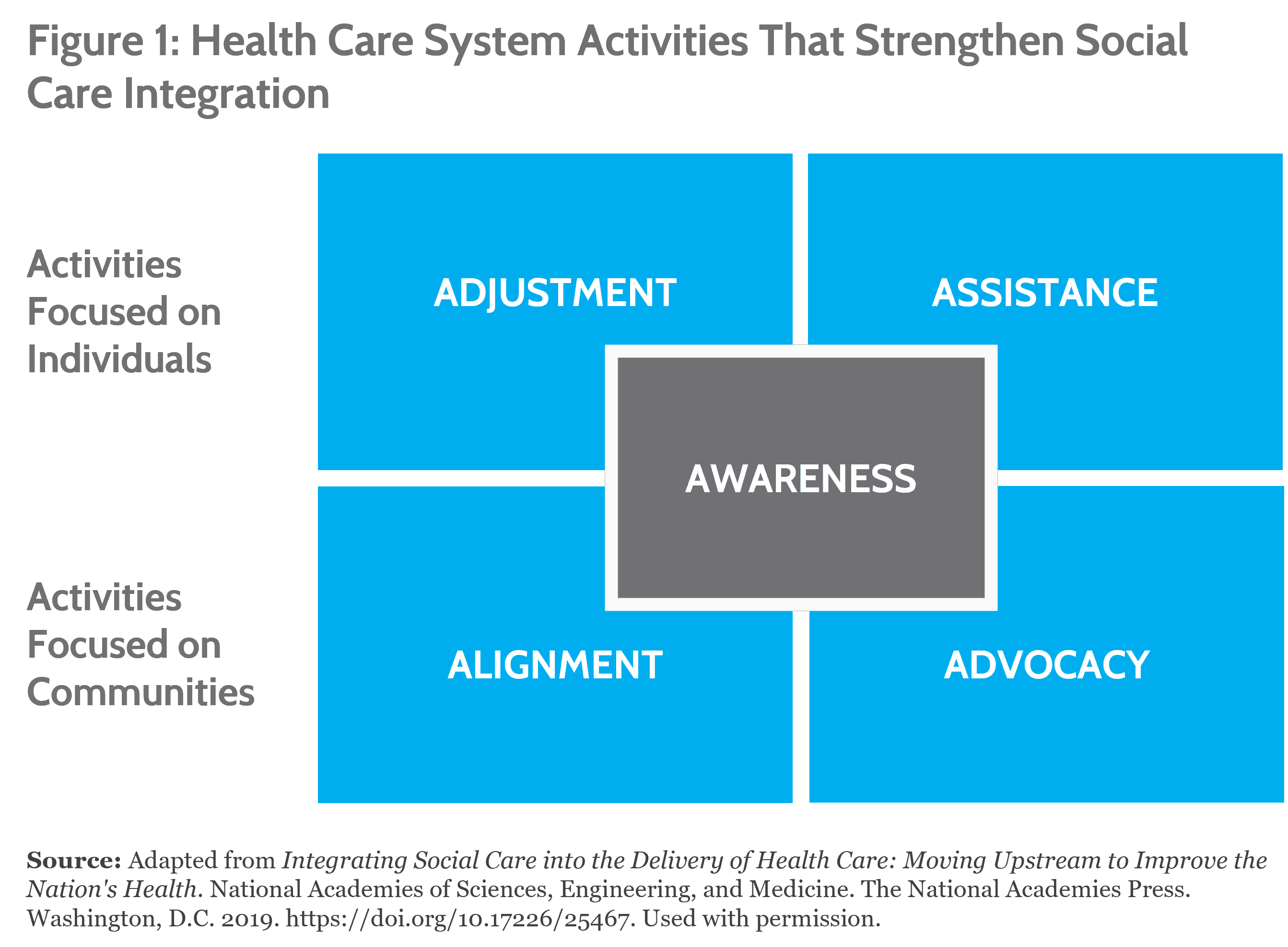 A 2019 National Academies of Sciences, Engineering, and Medicine (NASEM) report analyzed approaches to integrate social care into health care and offered evidence-based recommendations through a five-step framework focused on awareness, adjustment, assistance, alignment, and advocacy (see Figure 1). Using this framework, essential hospitals can assess patients’ needs through screening for social needs, adjust clinical care to acknowledge social barriers, assist patients, align with community needs, and advocate for larger structural changes.