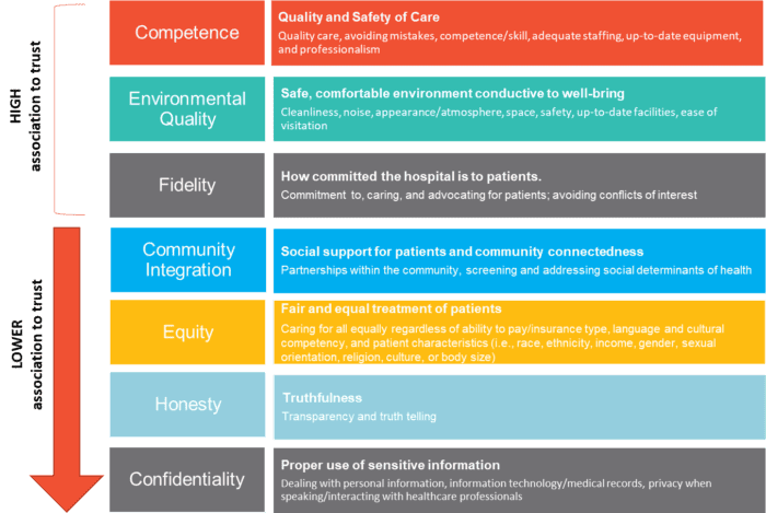 Survey items were inspected individually and as a group with other items measuring the same dimension before being included in the final data analysis. For example, data analysts tested that responses to items in a singular dimension were related to each other. Once the nonrelated responses were removed, data analysis could be used to determine which dimensions were most associated with overall trust. Patient and caregiver demographics, coupled with essential hospital data, enabled further examination of differences in overall trust across various patient and hospital characteristics.