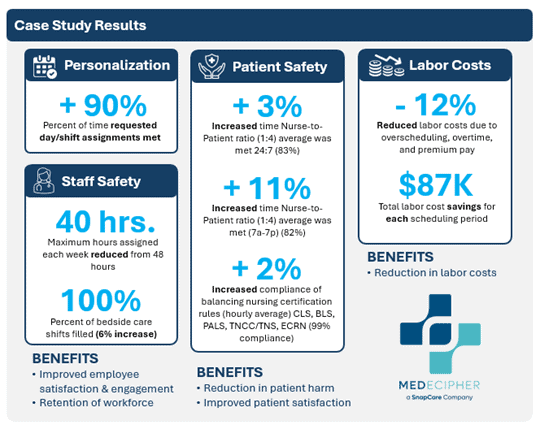 The assessment revealed that innovative technologies like Medecipher’s software can make self-scheduling a viable solution for this ED. The software automatically assigns and balances shifts based on predefined scheduling rules, ensuring a fair and unbiased schedule. This innovative approach not only promotes equity but also enhances staff and patient safety while reducing labor costs.